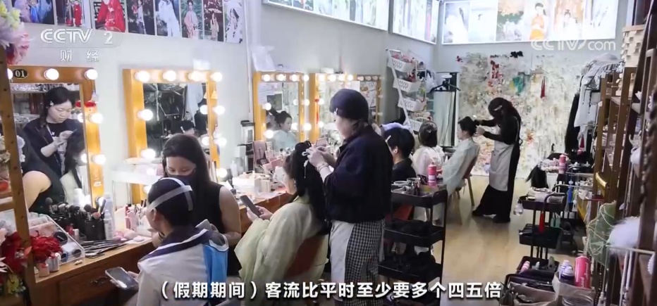 在西湖边的一家汉服店,记者注意到,从早上门店开门,就陆续有游客前来咨询;另一边,化妆师们手法娴熟地给客人上妆、盘头,并根据他们的喜好来推荐适合的服饰和妆造。汉服店老板忙的不亦乐乎:“假期期间,客流比平时多个四五倍,别说吃饭了,喝口水都难,很多客人就在这里排着。如果说从早到晚忙不停的话,一天至少接待100个客人。”